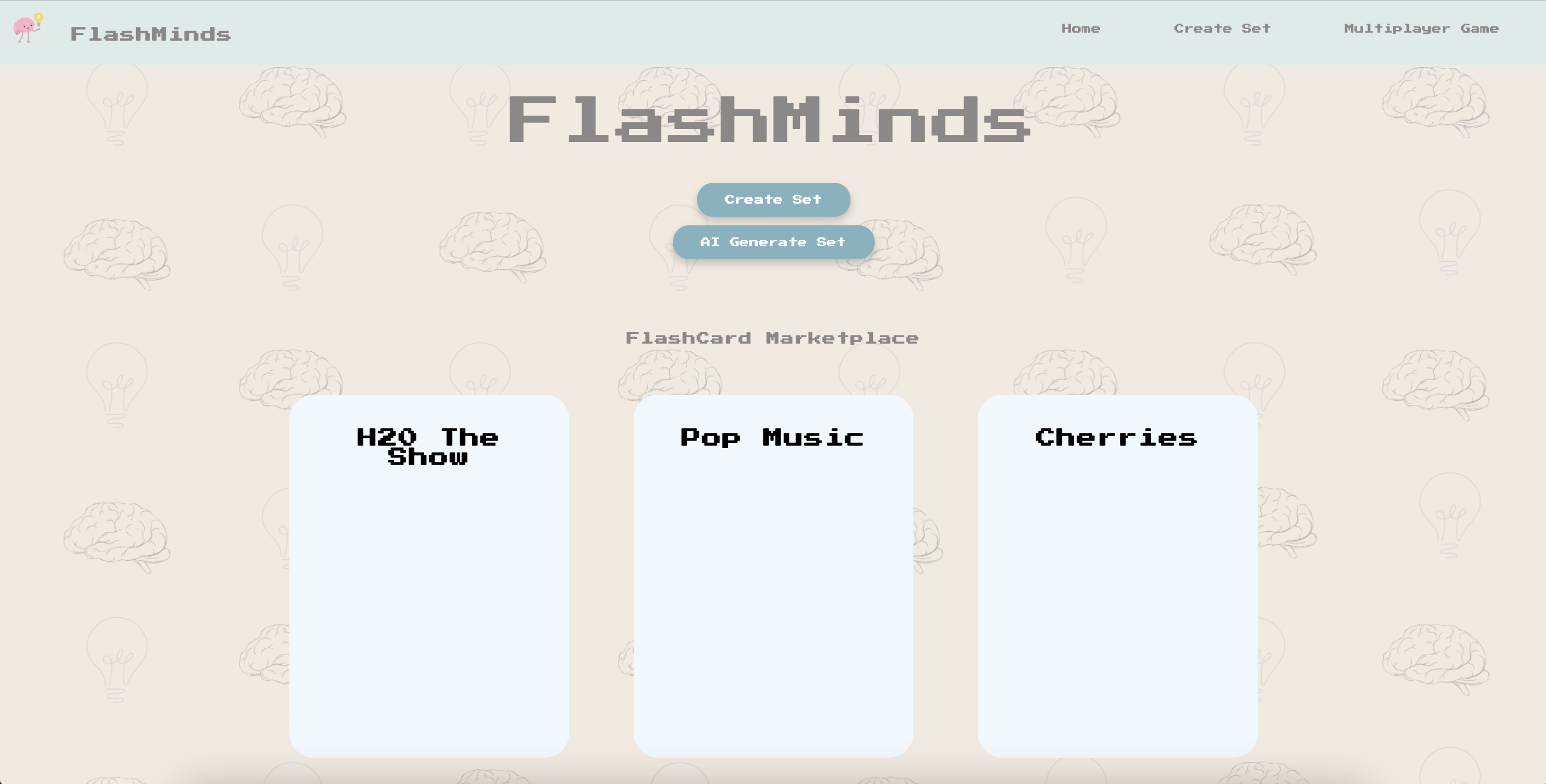 FlashMinds is a web-based flashcard platform that allows users to create custom sets, generate flashcards with AI, and compete in multiplayer quiz games.
