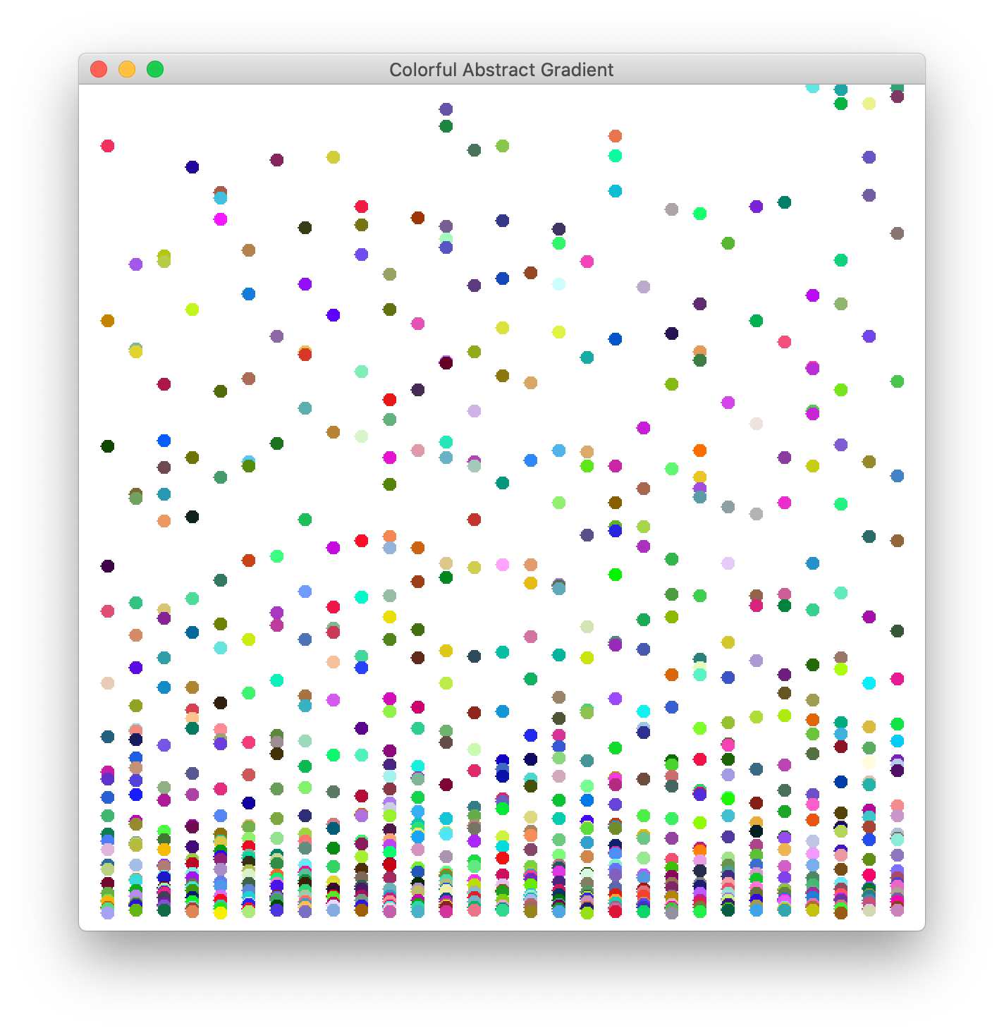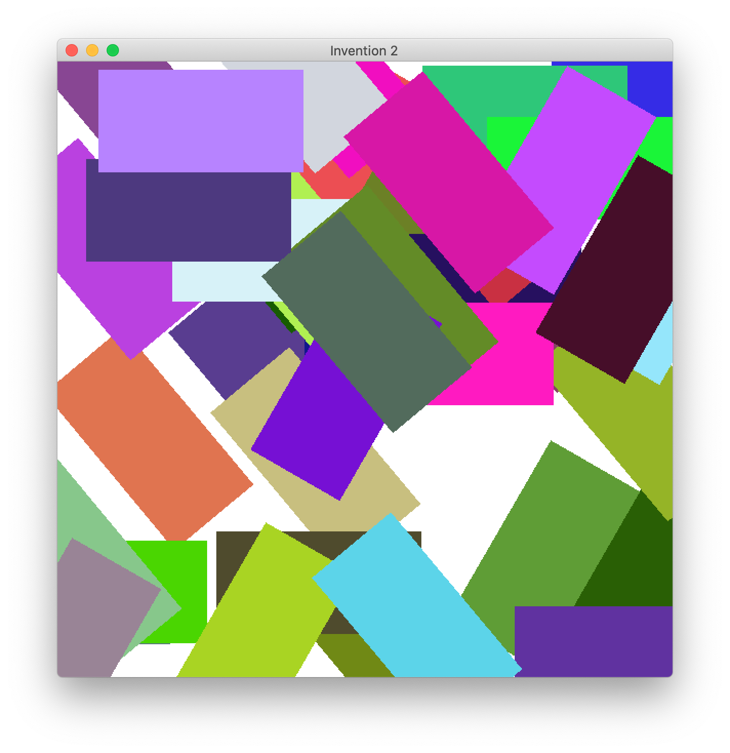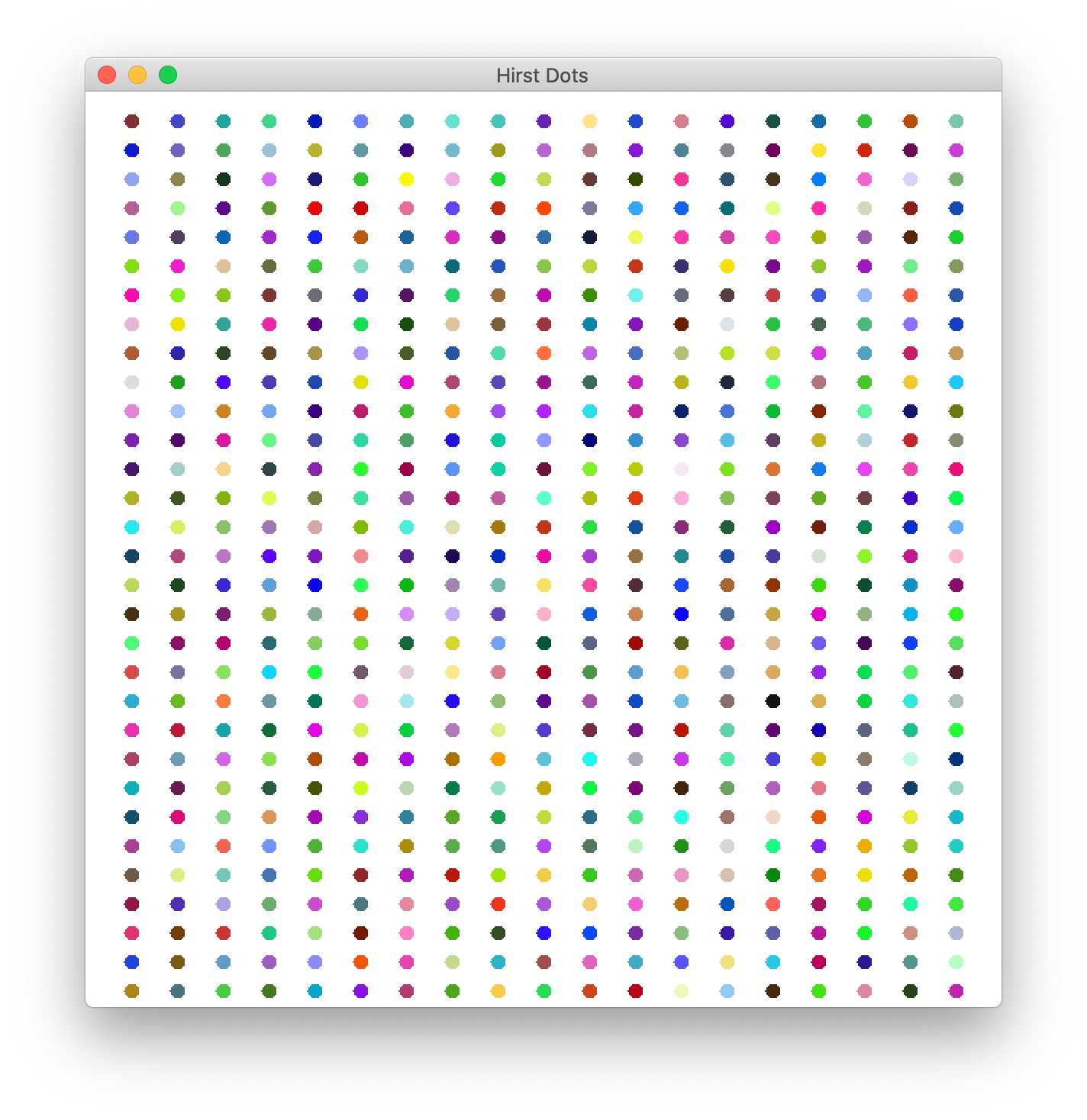 Programming Challenge 4 "Nonrepresentational Artistic Expressions" TextRectangles code + TextRectangles demo | AbstractGradient code + AbstractGradient demo | ColorfulAbstractGradient code + ColorfulAbstractGradient demo | HirstDots code + HirstDots demo | SimpleDots code + SimpleDots demo | Invention1 code + Invention1 demo | Invention2 code + Invention2 demo | Stella code + Stella demo |