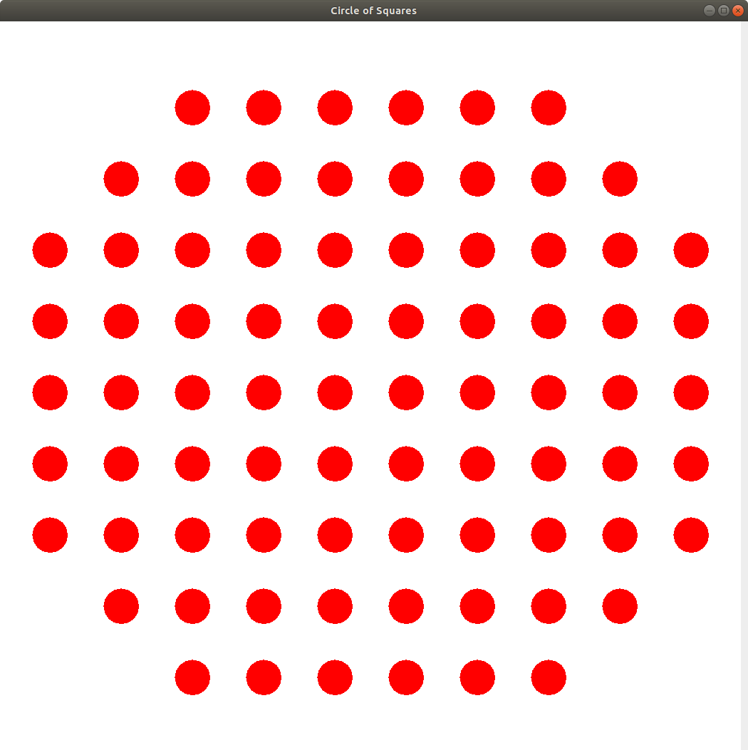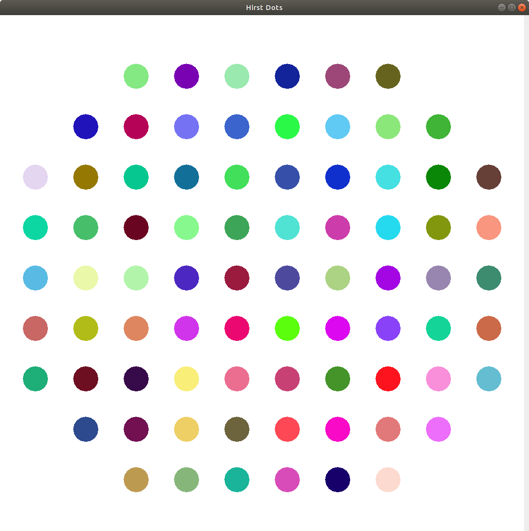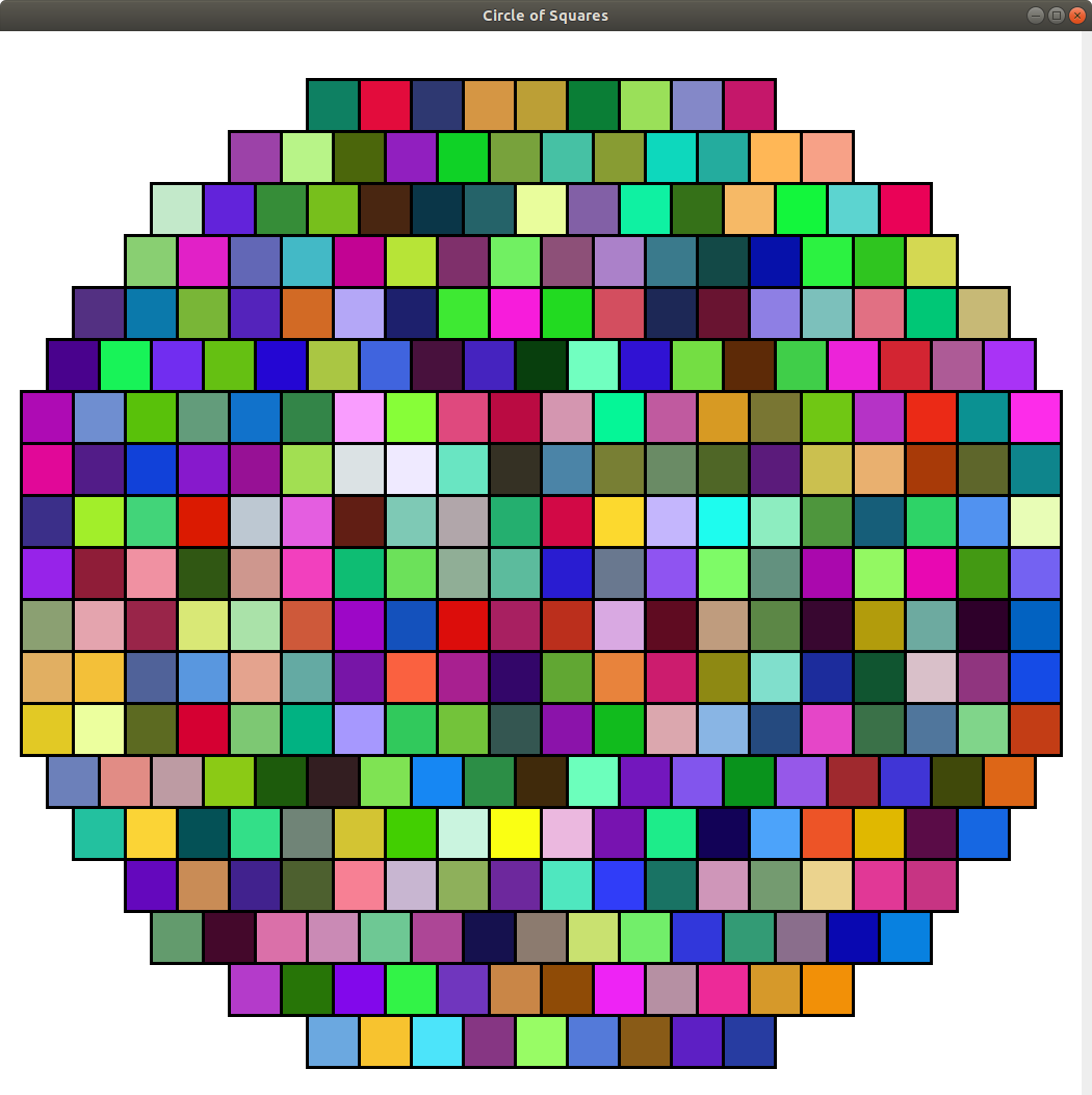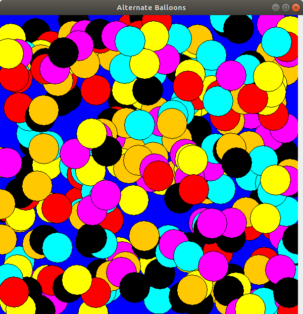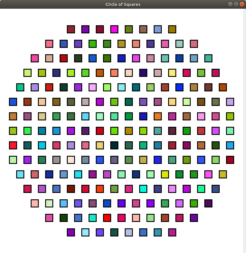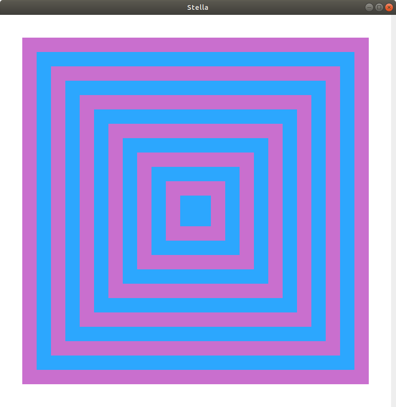 Programming Assignment 4: Nonrepresentaional Artistic Expressions" Gain experience creating and using objects, with program modification, using selection and repitition constructs, and exploring the notion of creativity from constraint in the course of microworld problem solving. TextRectangles code + TextRectangles demo | CircleOfSquares code + CircleOfSquares demo | HirstSquares code + HirstSquares demo | HirstDots code + HirstDots demo | SimpleDots code + SimpleDots1 demo + SimpleDots2 demo | Invention1 code + Invention1 demo | Invention2 code + Invention2 demo1 + Invention2 demo2 | Stella code + Stella demo 1 + Stella demo 2 + Stella demo 3